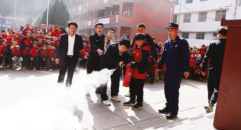 近日,丹鳳縣巒莊派出所、交警中隊(duì)、消防所和市監(jiān)所聯(lián)合在巒莊鎮(zhèn)中心小學(xué)舉行法治安全教育報(bào)告會(huì),全校600余名師生及后勤保障人員參加會(huì)議。圖為消防員現(xiàn)場教學(xué)生代表使用滅火器進(jìn)行滅火演練。 (本報(bào)通訊員 曹婧豐 攝)
