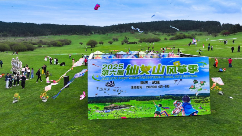 開幕儀式上,“DIY武隆愿景風箏”環節吸引眾多嘉賓和游客們的參與,大家拿起畫筆,在一只大型風箏上寫下自己的期望與祝福。隨著重慶市武隆區人民政府副區長何圣春宣布“2025第六屆仙女山風箏季開幕”后,形態各異的風箏乘風而起,同時,DIY愿景風箏化身“天空郵局”的信使,載著千萬份祝福飛向云端。