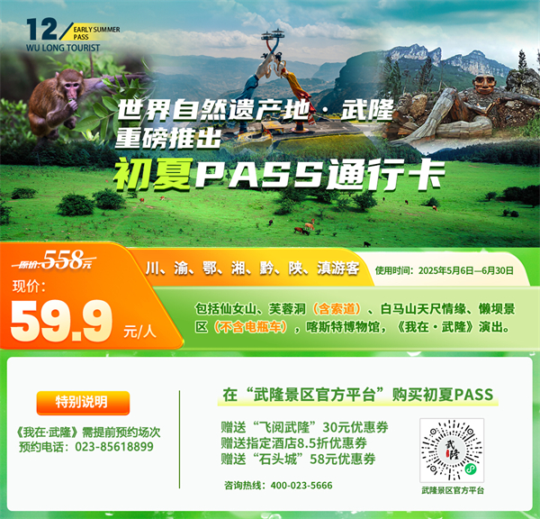 @川渝鄂湘黔陜滇籍的朋友們,還在煩惱5、6月去哪找清涼?這不武隆景區(qū)新推出的初夏Pass為你解憂了,你跟著沖就對(duì)了!2025年5月6日—6月30日期間,川渝鄂湘黔陜滇籍游客,轉(zhuǎn)發(fā)武隆旅游Pass卡相關(guān)信息到朋友圈,只需59.9元,就能解鎖價(jià)值558元的仙女山、芙蓉洞(含索道)、白馬山天尺情緣、懶壩(不含電瓶車)景區(qū),《我在·武隆》演出,喀斯特博物館,簡(jiǎn)直是性價(jià)比天花板!