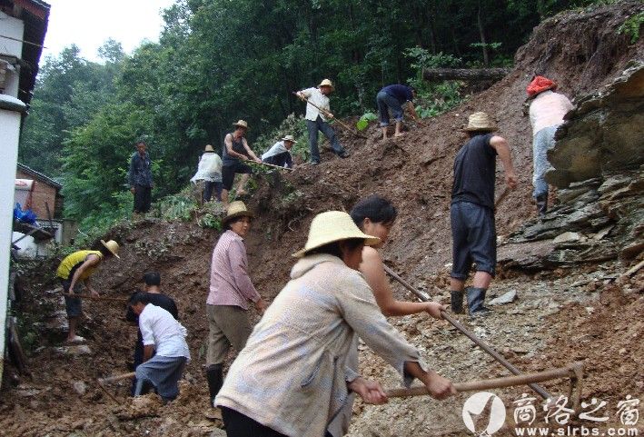 本網訊 7月8—18日,商南縣趙川鎮連遭兩次特大暴雨襲擊,造成大面積經濟林沖毀、電力通訊中斷、鄉村公路、橋涵、河堤、自來水管道沖毀嚴重。山體滑坡330處,威脅農戶16戶52人。圖為趙川鎮前川村前坡組群眾李德明房后山體滑坡3000多立方,危及其一家5口人的生命財產安全。鎮、村、組干部及時組織群眾冒雨清除滑坡體。(周銀祥劉芳攝)