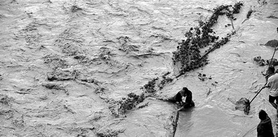 洪災(zāi)造成山陽縣城多處河堤垮塌。為了確保縣城安全,抗洪搶險指揮部組織群眾加固河堤 胡國慶 攝
