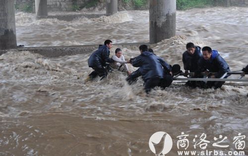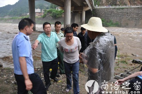 24日6時50分,柞水縣公安局110接到群眾報警:一女子被洪水圍困在柞水縣干佑大橋橋墩橫梁上,十分緊急,請求救援。險情就是命令,接警后,110迅速將警情下達到干佑派出所以及巡特警大隊。受令民警迅速趕往出事地點,只見一名女子趴在河中心橋墩橫梁上,橋墩四周全被淹沒,女子情緒激動,幾次險些跌落水中,而此時河水還在上漲,情況非常危急。由于沒有專業的救援工具,現場民警無法實施有效救援。公安局立即指令政委王瑤帶領機關值班領導和消防應急救援大隊11名消防戰士、巡特警大隊10名民警,攜帶保險繩、長纜繩、伸縮梯等救援器材,火速趕到事發地開展營救工作。干警們下到水中,在洪水中艱難前行,在距離女子十余米處將用于營救的伸縮梯一端搭到橋墩橫梁上,另一端由站在淺水區的多名民警雙手托住,舉在水面上。兩名消防戰士身系覽繩沿梯子爬到橋墩橫梁上,用長纜繩系住女子腰部,1名戰士護送女子從梯子往岸邊方向爬行,行進約兩米時,伸縮梯滑落,婦女連同救援戰士落入洪水之中,周圍的群眾同時發出驚呼,淺水區救援人員奮不顧身的迅速牽拉纜繩,將落水女子和戰士拉到岸邊,營救人員迅速將該女子抬上岸邊,立即送縣人民醫院搶救。經醫院檢查,該女子身體狀況良好,未受到損傷。民警一邊聯系其親屬,一邊為該女子找來干衣服,購買了新鞋襪,并安排女民警對其進行照看。