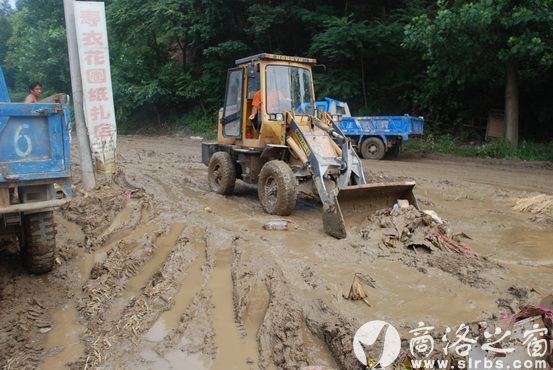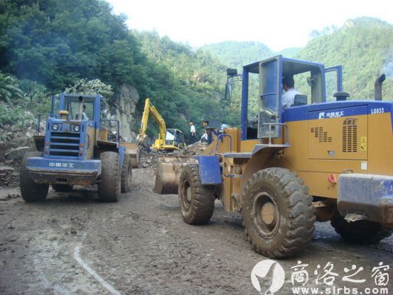 大批機械在中斷的商鄖路進行搶修