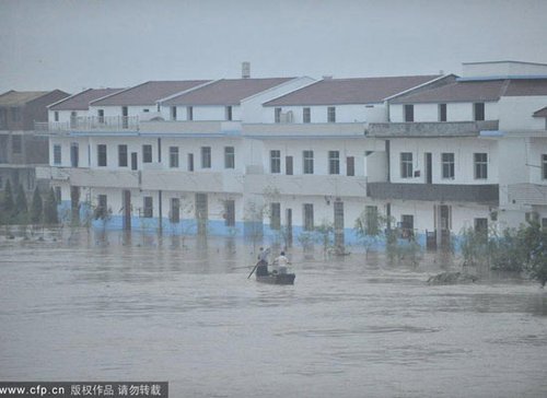 決堤造成羅針鎮、唱凱鎮受災嚴重。22日下午,記者隨南京軍區救援部隊坐沖鋒艇進入羅針鎮附近村莊解救被困群眾,只見福銀高速兩旁的村莊全部被淹,方圓百里,已成汪洋一片,被淹區域平均水深1至2米;在低洼處,許多兩層高的房子被水淹的只見屋頂,緊急趕至的各路大軍駕駛沖鋒舟、橡皮艇小心穿梭其中,接運受困民眾。