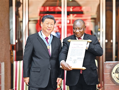 會談后,拉馬福薩向習近平授予“南非勛章”,這是南非授予重要友好國家元首的最高級別勛章和最高榮譽。