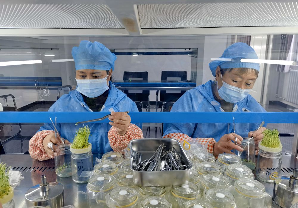 技術人員在河北省張家口市德勝村一處育種室內培育微型馬鈴薯瓶苗(2024年2月4日攝)。新華社發