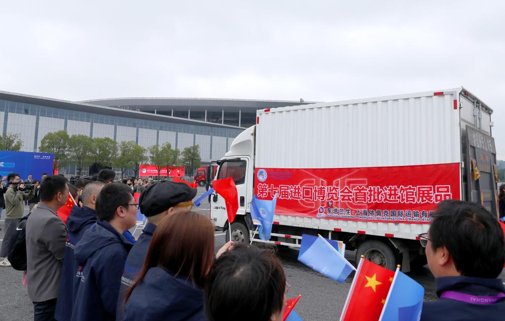 10月22日,裝載首批進館展品的卡車駛入儀式現場。當日,第七屆中國國際進口博覽會首批展品進館儀式在國家會展中心(上海)舉行。新華社記者方喆攝