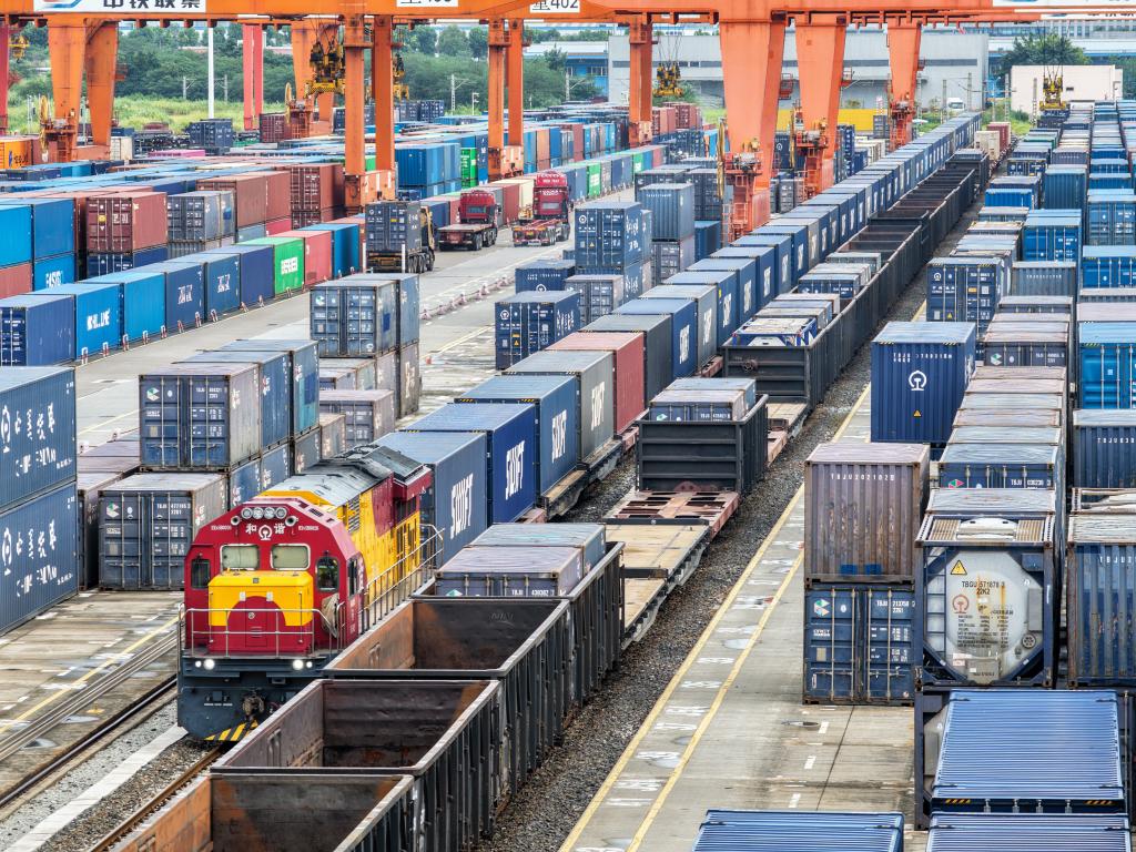 2025年9月8日,滿載“重慶造”汽車的中歐班列(成渝)在重慶團(tuán)結(jié)村中心站等待發(fā)車(無(wú)人機(jī)照片)。 新華社記者 唐奕 攝