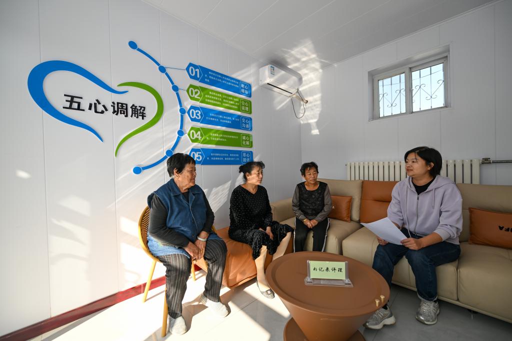 在天津市寧河區(qū)蘆臺(tái)街道金華路社區(qū),社區(qū)黨總支副書記吳蕊(右一)就社區(qū)監(jiān)控設(shè)備安裝問(wèn)題為社區(qū)居民進(jìn)行解答(2024年10月11日攝)。金華路社區(qū)積極踐行新時(shí)代“楓橋經(jīng)驗(yàn)”,將原社區(qū)居委會(huì)閑置用地提升改造成為聯(lián)絡(luò)群眾的基層綜合治理陣地——“解鈴小院”。 新華社記者 孫凡越 攝