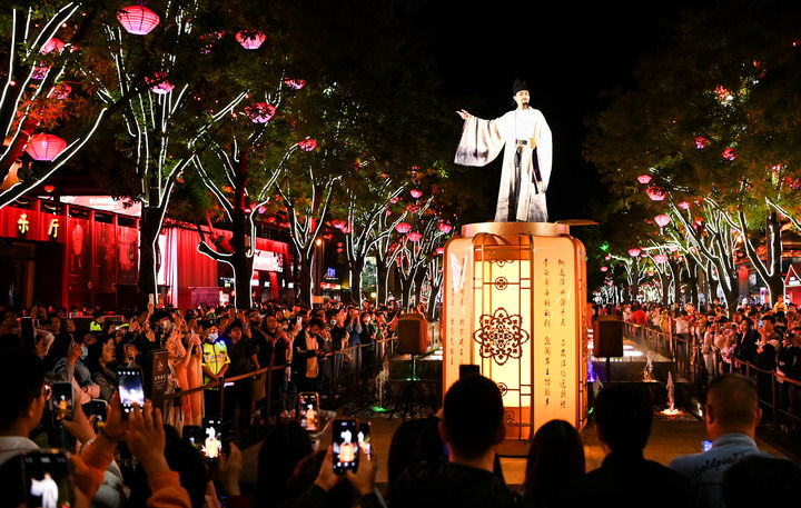 華燈初上,大唐不夜城一處高臺(tái)上,詩(shī)仙“李白”凌空而立,與數(shù)百名游客齊誦《蜀道難》,蔚為壯觀(guān)。