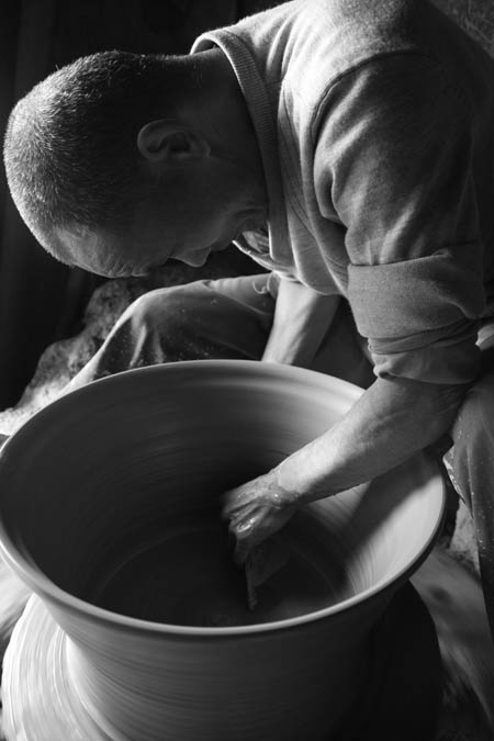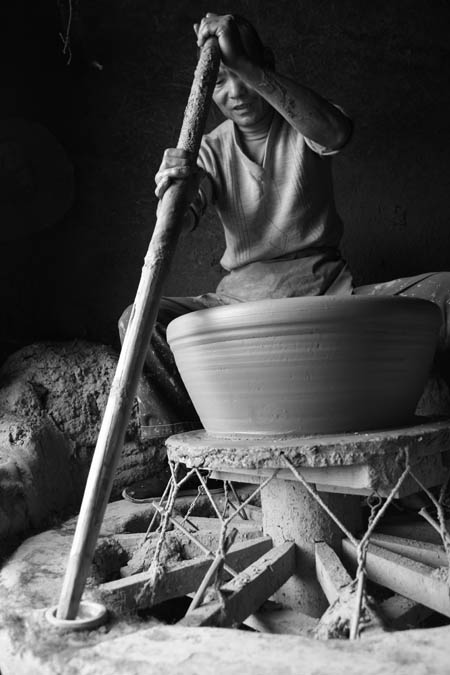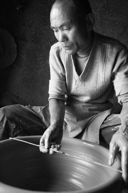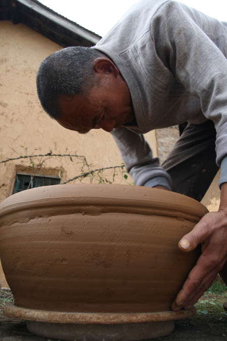 制陶的程序并不復雜,經(jīng)和泥、盤泥、臥泥,然后開始制作,晾曬到燒制。制作將泥放在輪盤上,用腳轉(zhuǎn)動輪盤,雙手仔細變化手勢,泥在郝悶長的手中不斷的變化各種形態(tài)。