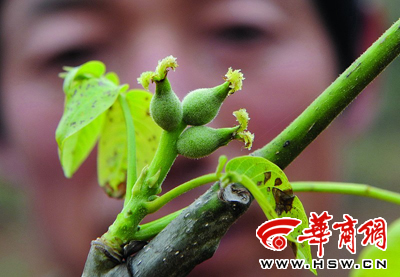 對此,商洛市核桃研究所高級工程師王根憲解釋說,開花的核桃樹屬于新疆的矮化品種,有著二次開花的傳統,但不能正常結果。之所以前些年在商洛地區沒有出現過這種現象,是因為氣候條件不具備,今秋屈建章家種的核桃樹開花掛果了,與國慶節期間的氣候回暖和地理位置有關。記者李杰攝影報道