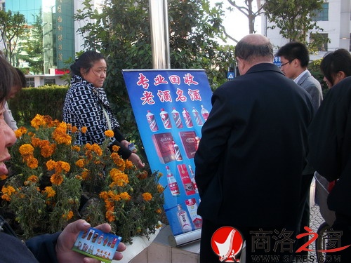 一個60歲左右的老人拿著兩瓶酒正要賣給收購的人,收購者說:"這瓶酒是84年的茅臺價值2000元,可惜你沒有好好收藏把瓶蓋子的封膜弄爛了,所以不能收購了。"這個婦女還向四周的群眾散發她的名片說能上門服務,現金交易。當下就有不少群眾表示回去以后看看家里有沒有"古董酒",會聯系收購人。