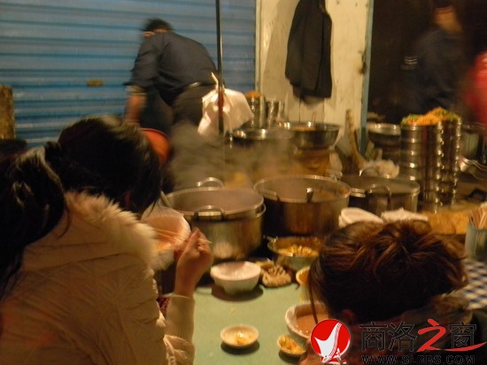 三四口大鐵鍋,五六條長板凳夾一個矮桌子,一對對男女老少擠坐在矮桌兩旁,呼呼抱著個碗喝個不停,人們喝著小紅豆伴著玉米面慢慢熬成的粥,讓旁觀者也讒言欲滴。精于做小吃生意的主人,不像豪華酒店和時尚酒吧門前的迎賓小姐那般光鮮照人,他們目不斜視,專心致志做手上的活。那些腰系圍布,衣著整潔,動作利索的大叔或大姐,操著商洛本地特色方言: "--來一碗吧!"語辭之中,絕無強人所難之意,但實在不忍心挪步。于是,坐下來,"給我來一碗糊湯…--",案板上,放著小菜,酸菜,拌蘿卜絲,辣椒,任你選,由你加。一塊五毛錢,會讓你覺得囔中之物,恰到好處,喝完會有十分的滿足感。