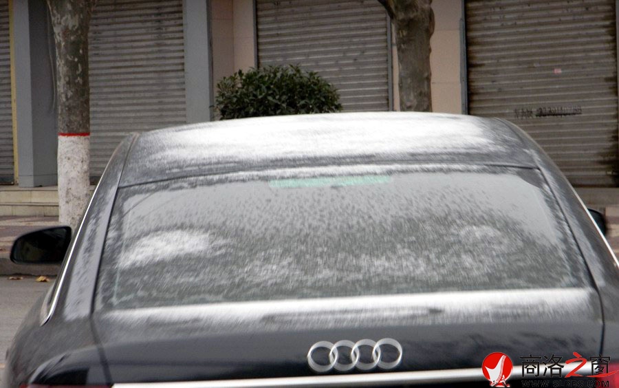 12月15日,拍攝于商州北新街西段,昨夜的小雪給汽車(chē)鋪上了一層薄薄的白雪。