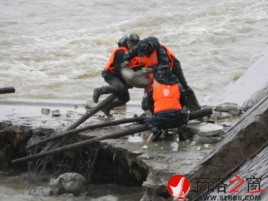 13日一大早,兩岸何堤危險處被拉起了警戒線,武警官兵出現(xiàn)在了搶險第一線。由于水流湍急,只能采用鐵絲籠裝沙袋填埋沉陷處和被淘空基石的措施防止洪水進一步肆虐。武警官兵們緊張地裝沙袋,再將沙袋裝進鐵絲籠中,裝載機將裝好沙袋的鐵絲籠拋入沉陷坑內(nèi)。由于基石下被水淘蝕,裝載機不能準(zhǔn)確地將沙袋放入,所以武警官兵必須下去站在僅剩的基石上將沙袋放進被淘空處。洪水咆哮,大雨無情。河堤上的人為站在基石上的武警官兵捏著一把汗,岸上的武警戰(zhàn)士小心地將沙袋沿著斜坡滾到基石上,下面的官兵迅速將沙袋裝入放在洪水中的鐵絲網(wǎng)內(nèi)。由于水流沖擊力大,武警戰(zhàn)士不得不用撬杠張開鐵絲籠口,沉重的沙袋在肆虐的洪水中如困獸般與武警戰(zhàn)士較量著,兩名戰(zhàn)士不得不壓低身體,幾乎是趴在撬杠上奮力地張著鐵絲網(wǎng)。