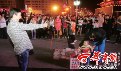 5月23日晚,商洛市丹江公園內(nèi),殷建行再次開始了義唱,圍觀的市民越來越多,虎永芳老人穿著義工服,維護著秩序。被殷建行的歌聲和善舉打動,市民、學生紛紛捐錢,幾百元、幾十元、幾元都有。