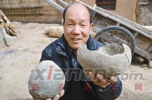 3月13日,記者在古城鎮(zhèn)某學校李老師家里看到,這枚圓石形狀較為怪異,狀如人頭模樣,外面有石質外殼,外殼和圓石可分離,外殼厚約2.5厘米,最薄處為1厘米;圓石直徑約16厘米,重約4公斤。據(jù)介紹,這枚圓石是從沙河河灘挖出來的。經(jīng)比對,與網(wǎng)上的恐龍蛋化石圖片很相似。所以不少人認為可能就是一枚恐龍蛋,洛南幾位文物考古學者也贊同這一觀點,不過他們也表示,需要更為專業(yè)的鑒定才能確定是否為恐龍蛋化石。(西安晚報 張紅中)
