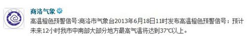 商洛日報訊 高溫橙色預警信號:商洛市氣象臺2013年6月18日11時發布高溫橙色預警信號:預計未來12小時我市中南部大部分地方最高氣溫將達到37℃以上。(商洛氣象)