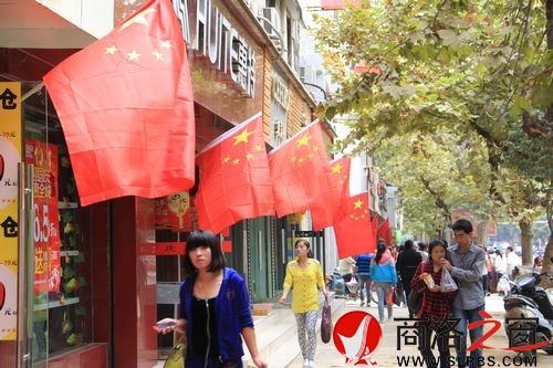 即使不留心,走在大街上也能隨時可見飄揚的國旗,文衛路、團結路、工農路,大家都不約而同地掛上了國旗,百利、天元、萬盛商場里,也處處可見。有些小店雖然沒插大紅旗,但是門口左右方都插了式樣較小的國旗。“今天是祖國64歲生日嘛,就是表達下自己的心意。”文衛路南段雜貨店王老板說道。