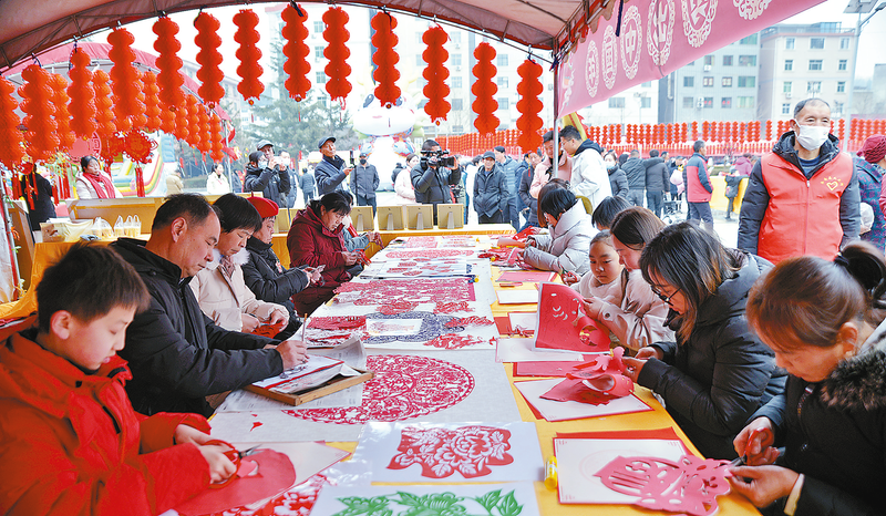 龍年春節前夕,我市廣泛開展形式多樣的文化藝術活動,營造了歡樂、喜慶、祥和的節日氛圍。圖為在來洛南趕大集·品山城煙火味系列活動中,人們興致勃勃地體驗非遺剪紙的樂趣。