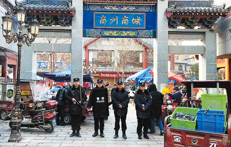 春節(jié)前后,公安商州分局在市區(qū)重點部位和人員密集場所安排武裝巡邏。圖為2月7日民警在商州商城維護秩序。