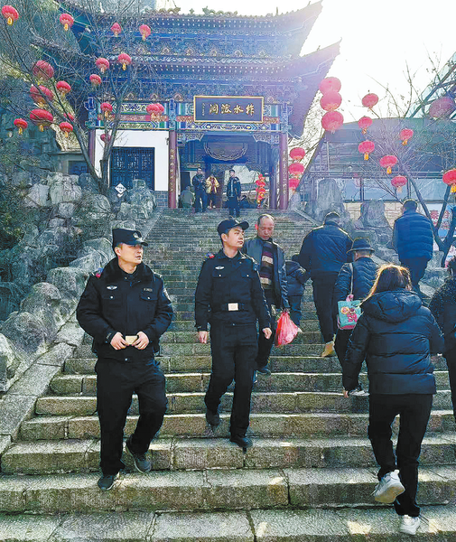 2月11日,柞水縣公安局下梁派出所民警在柞水溶洞景區(qū)開展巡邏執(zhí)勤工作。