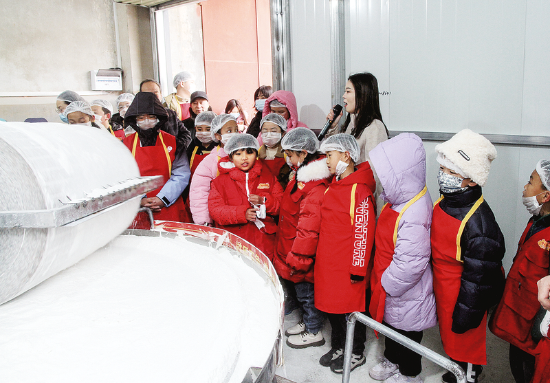 9時許,糧站師傅帶領小記者們來到古石碾坊觀看元宵制作原材料——糯米粉的制作過程。巨大的石磨不停旋轉,經過5個多小時浸泡的糯米被碾碎,看著碾磨糯米粉的復雜工序,小記者們爭相提問。“糯米在碾碎的過程中需要加水嗎?”小記者邵子笑率先發問。“經過浸泡的糯米不需要加水,只需要將其碾成粉末狀態就可以。”糧站師傅回答道。還有小記者問:“元宵不是滾出來的嗎?”面對這個問題,糧站負責人侯曉鵬笑著說:“制作元宵的第一個步驟是準備好需要的原材料,除了糯米粉,還有餡料,準備好了以后才可以滾元宵。”