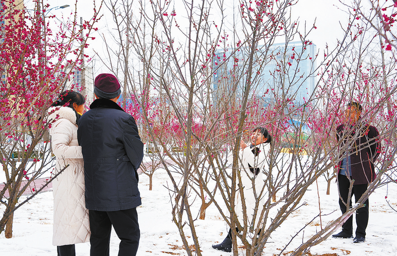 ▽2月23日,商州城區銀杏公園里的紅梅競相綻放,朵朵紅梅點綴在雪中分外好看,吸引了不少游客前來觀賞。 (本報記者 米子揚 攝)