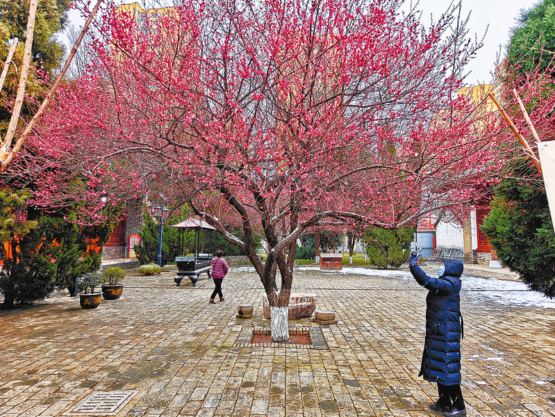 △2月21日,位于商州大云寺內的兩樹紅梅迎著風雪綻放,格外耀眼,吸引了市民前來觀賞、拍照留念。據了解,每年的2月下旬至3月初,大云寺內的梅花都會如期盛開,游客可免費進院觀賞。 (本報記者 楊 鑫 攝)