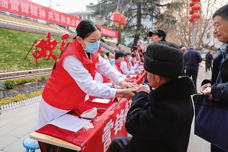 ?為進一步弘揚雷鋒精神和志愿服務精神,3月5日,山陽縣人民醫院組織呼吸內科、消化內科、交大一附院頜面外科等5個專科業務骨干組成志愿服務隊,在縣政府廣場開展學雷鋒健康義診活動,用實際行動詮釋雷鋒精神。 (本報記者 張 英 攝)