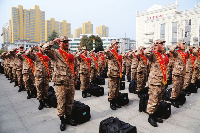 ?3月16日,商州區人武部在市區戲曲文化廣場舉行2024年上半年新兵入伍歡送大會,新兵們身披綬帶、胸戴紅花,帶著家人的熱切期望,奔赴軍營,踏上人生新征程。 (本報記者 王孝竹 攝)