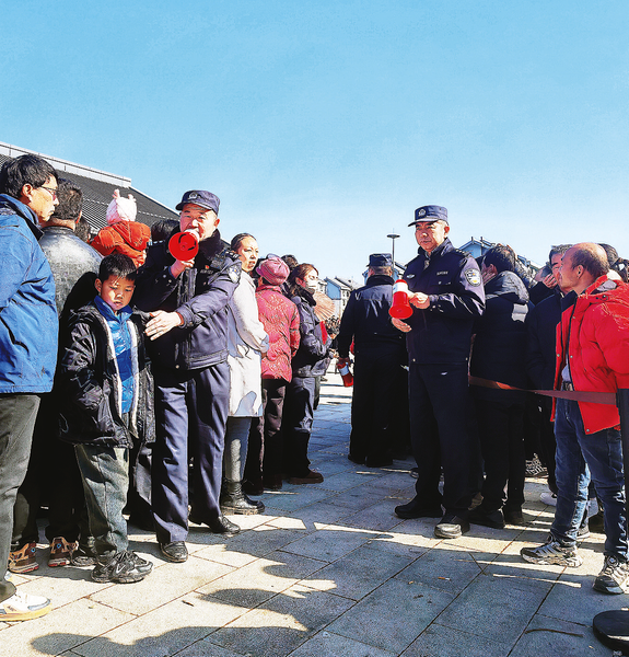 2月3日,洛南縣保安鎮舉辦農耕器具民俗風情文化惠民演出,保安派出所所長石軍平(左一)與同事喊話執勤,現場安保,維護秩序。(本報通訊員 胡文娟 攝)