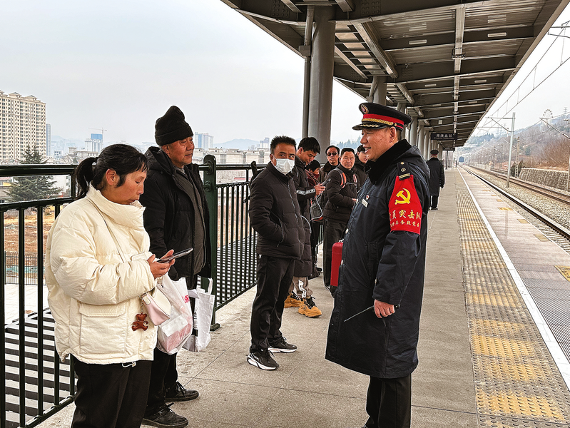2月11日上午,佩戴著鮮紅色“黨員突擊隊”袖章的田冬功正立在站臺上耐心解答乘客的問題。此時正值春運返程期,商洛北站候車的群眾井然有序地經(jīng)過候車大廳的安檢處,踏上臺階,往站臺上走去。