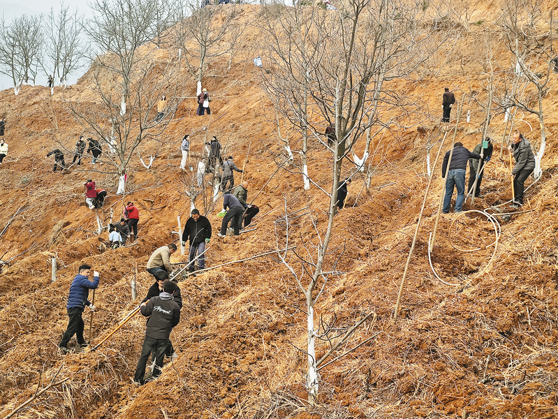 連日來,我市各地紛紛開展義務植樹活動,大力營造植綠、愛綠、護綠、興綠的良好氛圍,以實際行動做生態文明建設的實踐者和推動者。圖為3月12日,丹鳳縣棣花鎮組織干部職工在核桃主題公園開展以“踐行生態文明 守護綠水青山”為主題的植樹活動。 (本報通訊員 李夢玉 攝)