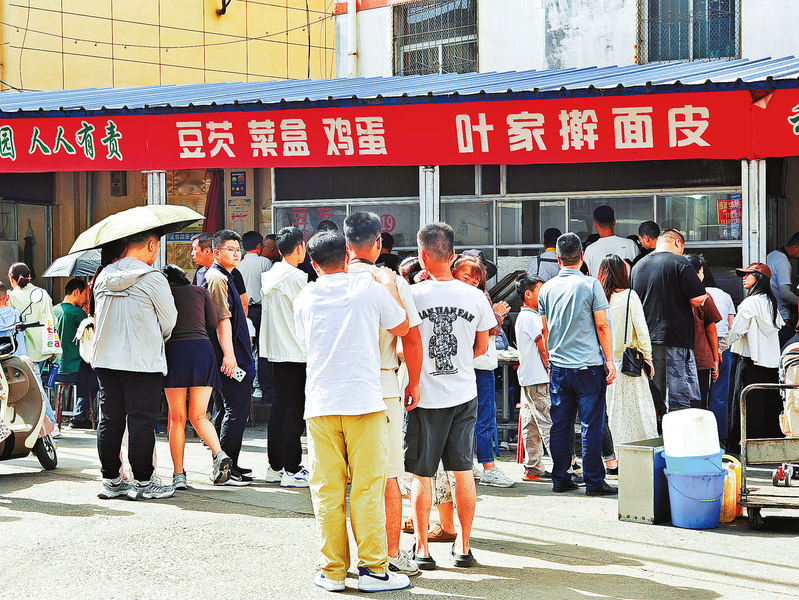 “五一”假期,位于商州區的和平早餐市場因其有著眾多商洛地方特色名小吃而吸引了大批游客前來品嘗。圖為5月3日,和平早餐市場名小吃葉家搟面皮攤位前排起了長隊。 (本報記者 楊 鑫 攝)