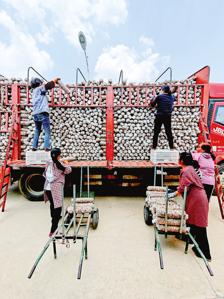 5月28日,位于四皓街道的嶺南生物科技示范產業園里,工人正在把菌棒轉移至大棚內,為出菇做好準備。該園區年產香菇菌袋2000萬袋,食用菌菌種200萬袋。食用菌基地累計解決群眾就業2000多人,帶動群眾實現家門口就業。