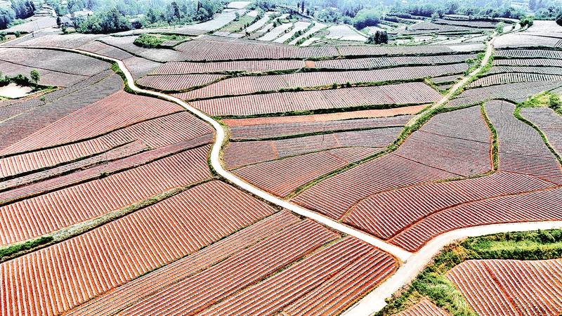 今年,四皓街道發展烤煙1.2萬畝,是全市烤煙第一大鎮。據統計,600多戶農戶戶均種植烤煙15畝,戶均年收入12萬元,是群眾穩定增收致富的一大主導產業。圖為5月28日,記者用無人機拍攝的四皓街道柴峪嶺上的煙田美如畫。