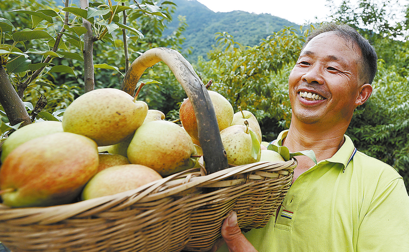 8月9日,在丹鳳縣商鎮王塬村,水雜果種植戶捧著剛摘的脆梨,掩不住滿臉喜悅。 (本報通訊員 阮世喜 攝)