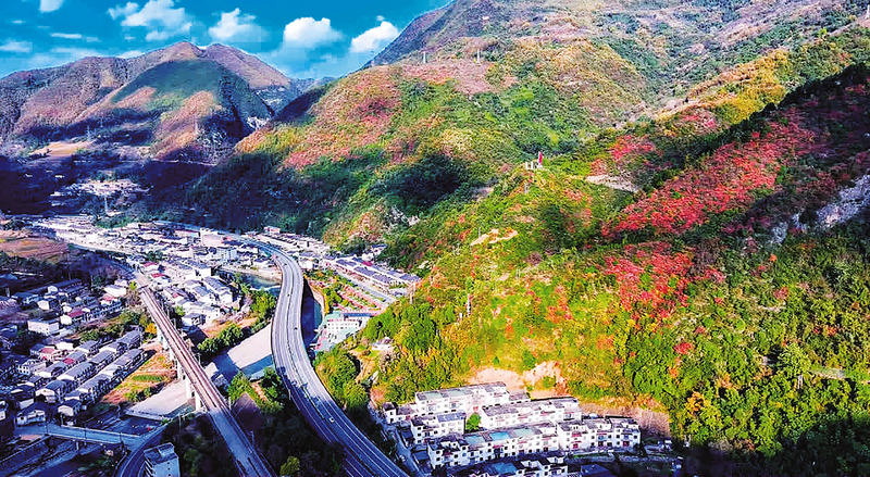 △在柞水縣下梁鎮(zhèn),紅綠相間的葉子層層疊疊點綴在山間,把小鎮(zhèn)周圍變成了彩色,遠遠望去煞是美麗。