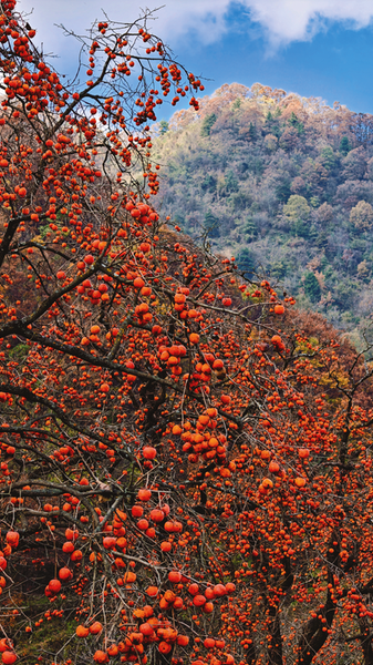 △在商州區(qū)楊斜鎮(zhèn),火紅的柿子掛滿枝頭,在遠山的映襯下構成秋天山村最美的風景。