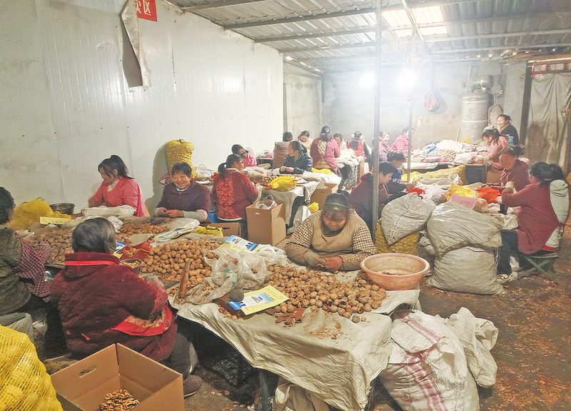 12月2日,丹鳳縣鐵峪鋪鎮中心村一處核桃加工作坊內,務工群眾正在加工核桃仁。據悉,該加工作坊由本地客商李樹廉創辦,帶動周邊20多名群眾就近務工,每人每天收入40元至60元不等。 (本報通訊員 田 東 攝)