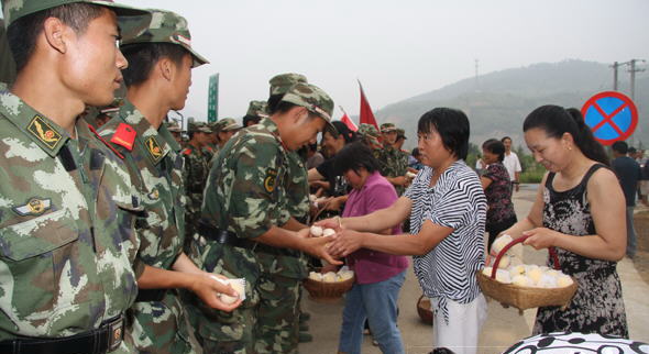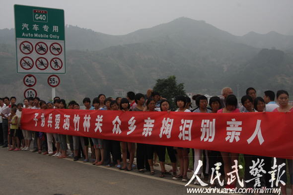 經(jīng)過武警陜西總隊400余名官兵連續(xù)11天的奮戰(zhàn),8月7日,陜西省商洛市丹鳳縣竹林關(guān)鎮(zhèn)人民群眾已基本恢復(fù)正常生產(chǎn)、生活秩序。武警官兵凱旋時,竹林關(guān)鎮(zhèn)的鄉(xiāng)親們紛紛涌向部隊途經(jīng)的路口,揮淚相送、依依惜別。