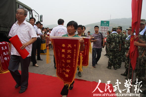 聽說官兵們要走了,受災(zāi)村民特意制作了錦旗以表謝意。 圖片來源:人民武警報