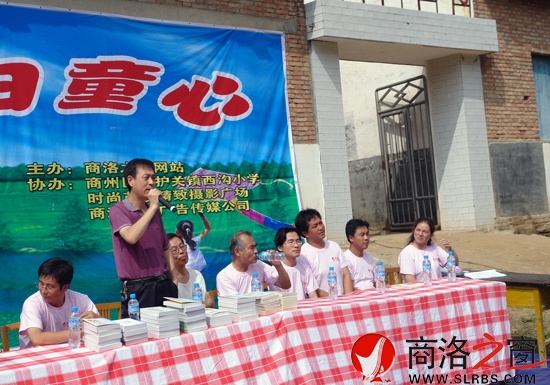 "山美,水美,咱們牧護關的人更美……"活動在主持人對牧護關的贊美聲中開始了。商洛日報前任總編張中山向現場的孩子們講述了牧護關古老的歷史并贈送了書籍。商洛日報社總編劉少鴻的書籍由副總編牛建宏代送給學校、周末版編輯部主任郝忠慧的書籍由商洛之窗網站副站長代送給學校。當得知商洛之窗網站要在牧護關西溝小學舉辦"回歸童心"主題公益活動時,陜西省書法家協會會員張源昌、江蘇省知名書法家楊峰在百忙之中抽出時間前來參加并將現場撰寫的書法贈送給學校和孩子。為了把自己的快樂帶給孩子們,商洛日報社編報部副主任牛新平在活動的前一天晚上,耗費兩個多小時,專門創作了一幅精美的漫畫。主持人呂百超現場亮出自己的絕活"貫口相聲",并朗誦了《童話詩》。瞿珊珊、劉文奇和網站的工作人員分別為孩子們演唱了《種太陽》、《但愿人長久》等歌曲。為感謝我們的到來,孩子們還表演了兩個自己編排的舞蹈,學校里的一位老師現場改唱了歌曲《常回家看看》。活動結束時,應邀的領導和西溝小學校長一起為孩子們分發了200多張照片,之前在商洛日報周末版報道過此事。
