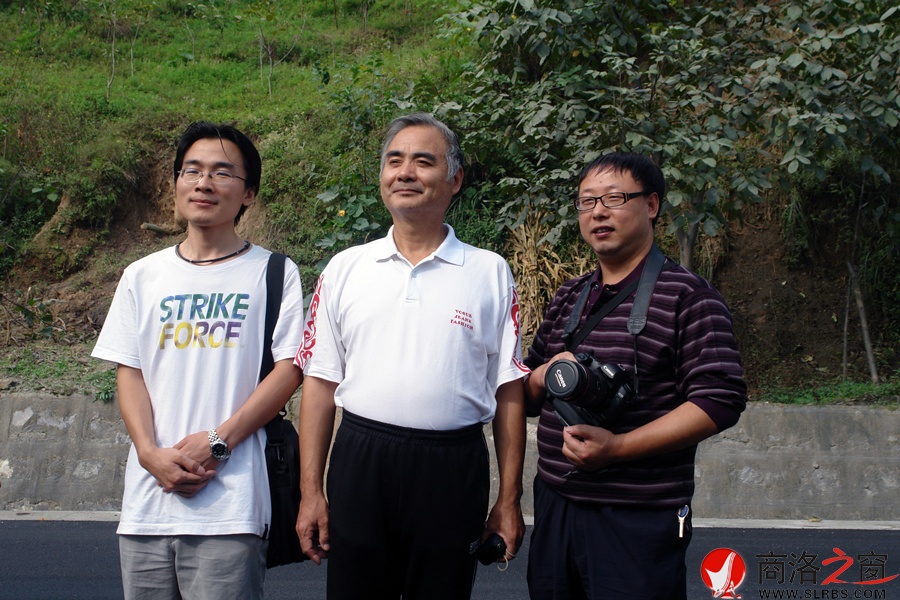 市文藝評論家協會副主席張源昌先生(右二),商洛攝影師劉琰珺先生(右一)與遠道而來的客人江蘇省知名書法家楊峰先生(左一)合影