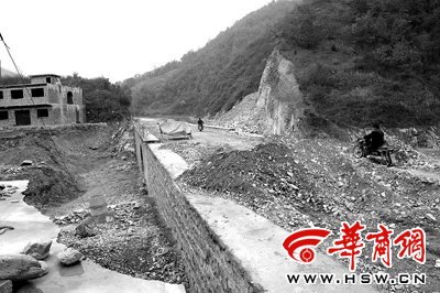 據(jù)惠忠義介紹,這座牛角灣橋修于1988年,橋下有一涵洞。由于北邊河床高,南邊河床低,之前河水倒灌進來泡壞了村民聶長喜和潘寶蘭兩家的莊稼地和房屋地基。今年“723”大水把橋沖斷后嚴重影響到了兩家的房屋,地基懸在空中,潘寶蘭家的樓房嚴重裂縫,成了危房。因此,他們想借這次丹鳳縣交通運輸局修復橋時能將洪水形成的莊基地垮塌處回填,以確保兩家安全。沒想到施工隊說,他們只按照圖紙施工,其他要求不能滿足。于是鐵河組便在11月11日晚叫鏟車在橋上堆土堵路。