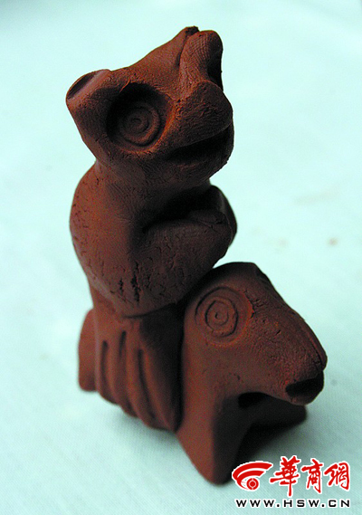 在商洛市中心以東2.5公里的丹江北岸,有個村子叫東龍山,村里的小娃們都會唱一首歌謠:“東龍山,拐個彎,龍山雙塔戳上天,龍梁上面高架板,男女老少坐一灘,狗娃咪,吹得歡……”“狗娃”是指泥捏成的玩具像小狗,而“咪”在當地方言里是哨子。