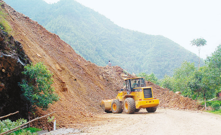15日上午,記者在203省道商州區(qū)和山陽縣交界處的上官坊村附近看到,巨大的山石滑落在公路路面上,仍不斷有碎石從山上落下。據(jù)悉,事發(fā)后,商州區(qū)公路部門立即組織人員緊急搶通了一條便道,小型車輛勉強可以通行,而在距離該處不足5公里的山陽縣五竹園段,也發(fā)生了大面積的山體滑坡,目前,多輛卡車和挖掘機正在清理山石。據(jù)現(xiàn)場的山陽縣公路段職工介紹,此次滑坡發(fā)生在14日中午,山石有1萬多方,搶險從14日下午就已經(jīng)開始,要想徹底清理完畢恢復(fù)通車,估計要到16日。