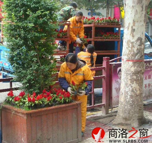 本網訊 (記者 王莉)商洛市為慶祝國慶節,工作人員正在用一盆盆雞冠花裝扮北新街道路兩邊的景觀樹,鮮紅的花朵為節日增添了喜慶的氣氛。